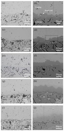 The microhardness of each sample was evaluated using a Vickers microindenter (FM-300e, Future-Tech, Kawasaki, Japan), with a 300 g load. Each indentation was taken at an interval of 0.1 mm from the top of the coating to the substrate. The average coating hardness is calculated based on the sum of all coating hardness divided by the total number of indentation points in the coating.