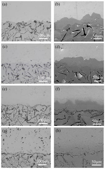 Optical (a,c,e,g) and SEM (b,d,f,h) micrographs of cold-sprayed IN625 coating on grey cast iron (GJL250) substrate at the interface for (a,b) 400-6, (c,d), 600-6, (e,f) 850-6 and (g,h) 1050-6. The description of the layers is shown in Figure 3b.