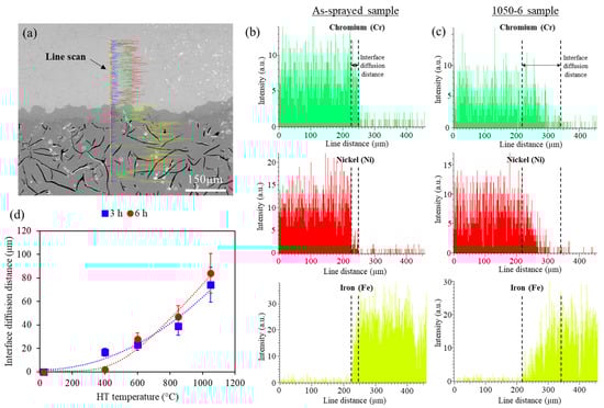 (a) SEM of 600-6 sample with the line scan location (representative sample), Elemental composition from a line scan for (b) as-sprayed and (c) 1050-6 sample, and (d) Interface diffusion distance at varying temperatures with 3 and 6 h hold durations.