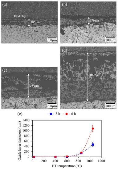 Oxide growth at the uncoated substrate area for (a) 850-3, (b) 850-6, (c) 1050-3, and (d) 1050-6 samples; and (e) Oxide layer growth as a function of heat treatment temperature and duration of the grey cast iron (GJL250) substrate.