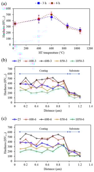 (a) Average coating hardness as a function of heat treatment temperature, and coating hardness profile across the sample cross-section for heat treated samples of (b) 3 h and (c) 6 h hold durations.