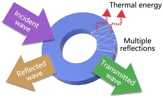Figure 1 shows the schematic diagram of the EM wave absorption mechanism. When EM waves are emitted from air to a composite material, some of them will reflect from or transmit through the material, while others will be absorbed by the material. The EM wave entering the absorbing material will be reflected many times, attenuated, and converted into heat energy [21,22,23].