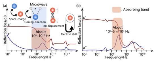 where and are dielectric and magnetic loss tangents, respectively [30,31,32]. Based on the formula of loss tangent, the loss capacity of materials can be improved by increasing the imaginary part of complex dielectric constant and complex permeability or by decreasing the real part [23]. Therefore, exceptional EM wave absorption results from the strong dielectric and magnetic loss capacities as well as the satisfactory balance between the two [27].