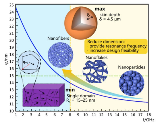 In general, the MAMs are divided into magnetic loss and electrical loss. Magnetic loss is often much less than electrical loss, so microwave absorbing materials mainly rely on electrical loss to dissipate EM waves. However, EM waves first need to enter into the materials, not to be reflected or scattered, and then to achieve impedance matching with the EM wave. Impedance matching often requires magnetic regulation. Therefore, the absorption frequency range mainly depends on the design of the magnetic part. The absorption frequency of materials is directly dependent on the particle size. Related to the absorption frequency of EM wave, there are the following size problems: the skin depth determines the maximum size of electromagnetic wave energy; the size of a single domain determines the minimum size of electromagnetic wave energy; quantum size effect, resonant absorption of microwave quantum and microwave absorbing unit. As shown in Figure 3, for frequencies below 8 GHz, the skin depth of the absorption unit is 4.5 µm, so the upper limit of the size of the MAMs below 8 GHz is 4.5 µm, which is much larger than that of nanometer materials. In large particles, energetic considerations favor the formation of domain walls. Magnetization reversal thus occurs through the nucleation and motion of these walls. As the particle size decreases toward some critical particle diameter, Dc, the formation of domain walls becomes energetically unfavorable, and the particles are called single domains. Changes in the magnetization can no longer occur through domain wall motion and instead require the coherent rotation of spins, resulting in larger coercivities. As the particle size continues to decrease below the single domain value, the spins are increasingly affected by thermal fluctuations and the system becomes superparamagnetic [53]. For magnetic materials with different crystal structures, the size of a single domain is slightly different, which can be determined by observing the average size of primary crystallinities by high-magnification TEM [15]. Generally, the size range is about 15–25 nm, so the lower limit of the size of MAMs is about 15–25 nm. When the size of the absorption unit is the same as the energy of the microwave quantum, the absorption unit will produce resonant absorption of the incident EM wave. The relationship between the size of the absorption unit and the microwave frequency is shown in Figure 3. The unit size of resonance absorption at the frequency of 1–8 GHz is about 10–25 nm. In addition, reducing the dimension can increase the anisotropy, and the enhancement of anisotropy can accelerate the spin relaxation time to increase the eigenfrequency. At the same absorption frequency, the size limit of low dimensional absorption units can be greatly relaxed to increase the design flexibility. Due to the tip effect and the edge effect, low dimensional magnets usually show strong magnetic coupling interaction. The formation of the magnetic coupling network can significantly improve the magnetic loss ability. To sum up, when designing low-frequency absorbing materials, low-dimensional (nanofibers or nanoflakes) strong magnetic metal materials above 15 nm can be selected as one of the components of MAMs.