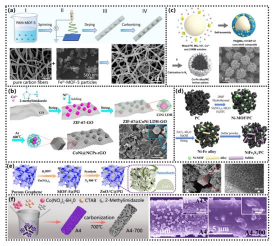 (a) The synthesis strategy of FMCFs composite. Adapted with permission from Ref. [89]. Copyright 2021, Elsevier. (b) The synthesis process of CoNi@NCPs-rGO. Adapted with permission from Ref. [93]. Copyright 2021, Elsevier, and the SEM images of MOF/GO hybrid. Reprinted with permission from Ref. [66]. Copyright 2017, Elsevier. (c) The formation process of Co–Fe alloy/N-doped carbon hollow spheres and FESEM images of Co–Fe/NC-700 hollow spheres. Adapted with permission from Ref. [94]. Copyright 2019, John Wiley and Sons. (d) The synthesis process of NiFe2S4/PC. Adapted with permission from Ref. [95]. Copyright 2022, Elsevier. (e) The synthesis process of ZnO/C@PG. Adapted with permission from Ref. [96]. Copyright 2021, Elsevier. (f) The synthesis of CF@ZIF-67 and CF@C/Co (carbonized at 700 °C) and their SEM images. Adapted with permission from Ref. [97]. Copyright 2021, Elsevier.