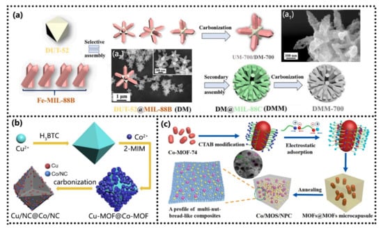 Composites of MOFs. Constructing multiple MOF-on-MOF heterostructures is challenging. Wu et al. [98,99] constructed the binary component DUT-52@MIL-88B (DM) by combining two unique anisotropic epitaxial growth strategies (Figure 10a). As shown in Figure 10(a2), the SEM image of DM shows a special hybrid structure of hexagonal pyramid column and octahedron. The formation of this structure is due to the selective growth of the guest MOF on the specific crystal facet of the host MOF. DUT-52@MIL-88B@MIL-88C (DMM) is formed by the ternary assembly. They can be converted into magnetic porous carbon-based absorbers (DM-700 and DMM-700) through a facile carbonization process. Compared with DM-700, the optimized absorber DMM-700 has an obvious effect of broadening the frequency band. As shown in Figure 10b, core–shell structure and bimetallic composition Cu/NC@Co/NC composites were designed and synthesized through the thermal decomposition of Cu-MOF@Co-MOF precursor [100]. Compared with the Cu/NC and Co/NC, the Cu/NC@Co/NC composite exhibits many excellent EM absorbing performances caused by the bimetallic composition and the unique core–shell structure. Peng et al. [101] prepared a series of Co, metal oxide semiconductor, and NPC composites with a multi-nut-bread structure by the one-step pyrolysis of capsule MOFs@MOFs (Figure 10c). The impedance matching and attenuation ability of the absorbers can be adjusted by tuning the type and content of “nuts” with different electromagnetic characteristics.