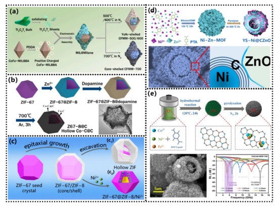 (a) The synthesis process of CFMM. Adapted with permission from Ref. [103]. Copyright 2022, Elsevier. (b) The synthesis of ZIF67-8@C and TEM image of ZIF67-8@C. Adapted with permission from Ref. [106]. Copyright 2021, Elsevier. (c1) The synthesis process of hollow ZIF. Adapted with permission from Ref. [105]. Copyright 2016, John Wiley and Sons. (c2) ZIF-67@ZIF8/Ni2+. Adapted with permission from Ref. [104]. Copyright 2021, Elsevier. (d) The synthetic process of yolk–shell Ni@C@ZnO microspheres. Adapted with permission from Ref. [107]. Copyright 2020, Elsevier. (e) The synthesis procedure of the FeCoNi@C nanocomposites and the SEM image of FeCoNi-MOF-900, RL of FeCoNi-MOF-700. Adapted with permission from Ref. [70]. Copyright 2019, American Chemical Society.