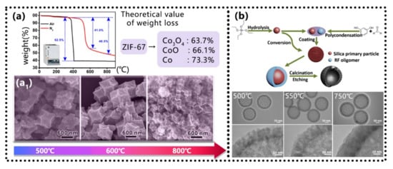 Previous studies have demonstrated that porous nanostructures of metal, metal oxides, carbon, or hybrids can be converted from MOF precursors by thermal decomposition, depending on calcination conditions, (e.g., atmosphere, temperature, and time) [108,109]. Figure 12a shows the TG curves of ZIF-67 precursors recorded under air and inert gas (N2). By comparison of the two curves, the total weight loss in the air is very close to the theoretical value of ZIF-67 into Co3O4. However, in N2, the total weight loss value is significantly lower than the theoretical value of ZIF-67 conversion to metal cobalt or its oxide. This result implies that during the thermal decomposition of MOFs under an inert atmosphere, organic components of MOFs can be directly carbonized, and metal ions are reduced in situ, thereby forming metal/carbon hybrids. However, even a small amount of oxygen in the atmosphere during thermal decomposition would lead to the preferential formation of metal oxides in the products. To avoid this situation, thermal decomposition should be carried out in a high-purity atmosphere as far as possible.