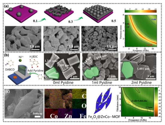 Liu et al. [111] successfully prepared one-dimensional sponge metal Co with strong magnetism at low frequencies through direct pyrolysis of Co3[HCOO]6·DMF parallelepiped and prepared Co/C composites with a unique interface structure. With an increase in the carbon content, the morphology of carbon changes from fragments to vertically arranged nanosheets, as shown in Figure 13a (S-Co/C-x, x means the weight of glucose that provides the carbon source). Jin et al. [112] prepared the film with controllable thickness by controlling the amount of pyridine added to Ni@NC Hexagonal nanosheets, whose morphology can be adjusted from nanorods, and nanoparticles to nanosheets with the increase in the doping content of N atoms (Figure 13b). The 3D conductive network of carbon framework and magnetic Ni nanoparticles could be obtained from the converted MOF precursor. The controllable dimension and morphology of the N-doped carbon skeleton endowed more electronic transportation paths, better anti-reflection surfaces, higher conduction loss, and polarization relaxation, while the evenly distributed Ni nanoparticles provided considerable multiple resonances and eddy current. Kong et al. [113] prepared the Fe2O3@ZnCo-MOF composites by the in situ growth method. By varying the loading of Fe2O3 during the synthesis process, a series of composites were obtained. Among them, CoFe alloys@ZnO@C-0.1 (Figure 13c) can reach the RL of −40.63 dB at a thickness of 2.2 mm, and the EAB is 3.8 GHz (4–7.8 GHz).