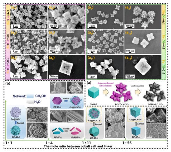 - Wu, F.; Li, Q.; Liu, Z.; Shah, T.; Ahmad, M.; Zhang, Q.; Zhang, B. Fabrication of binary MOF-derived hybrid nanoflowers via selective assembly and their microwave absorbing properties. Carbon 2021, 182, 484–496. [Google Scholar] [CrossRef]