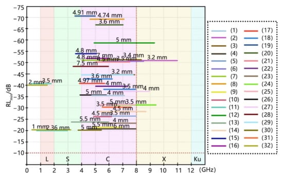 where is the effective input impedance , is frequency, is the thickness of the medium, and is the velocity of light. Equation (5) can be simplified to , where is the reflected power of EM wave on the surface of the material. When is less than −10 dB, the absorbing capacity of the material can reach 90%, so the frequency range of RL ≤ −10 dB is defined as the EAB. Of course, the smaller the RL value at a particular frequency, the better the absorbing performance is at that frequency.