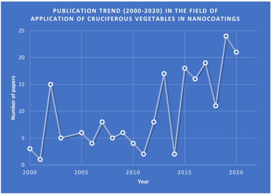 Publication trend (2000–2020) in the field of application of cruciferous vegetables in nanocoating (source of data: https://www.sciencedirect.com, accessed on 28 April 2022).