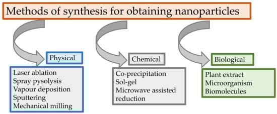 In the 21st century, finding new “green” materials with potential applications in various fields is an important goal. The use of these materials and the real interest in their research is due to green synthesis methods that have considerable advantages such as avoiding toxic chemicals, high cost, and severe reaction conditions []. Even direct precipitation, the sol–gel method, reverse micelles, thermal decomposition, or the solvothermal method was successfully used for the obtaining of metallic nanoparticles; “green methods” (with biological sources such as bacteria, fungi, yeast, actinobacteria, and plants) can be used as well (Figure 4).