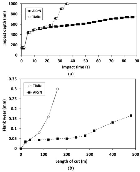- Mo, J.L.; Zhu, M.H.; Leyland, A.; Matthews, A. Impact wear and abrasion resistance of CrN, AlCrN and AlTiN PVD coatings. Surf. Coat. Technol. 2013, 215, 170–177. [Google Scholar] [CrossRef]