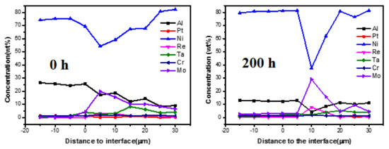 The diffusion of Cr, Mo, and Ta elements from the substrate to the coating can be seen in Figure 5, revealing that after 200 h of thermal exposure, the content of Mo in some areas of the coating reached 2.83%. After 200 h of diffusion, 0.16 wt. % of Re was measured in the coating, indicating the diffusion of Re from the substrate to the coating.