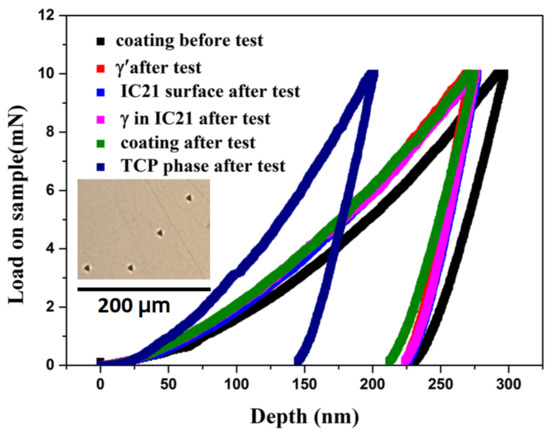 The stability of mechanical properties at a high temperature of superalloy has a vital impact on its service life. For macroscopic materials, the overall mechanical parameters of the material can be obtained by high-temperature tensile tests. However, in the case of the mutual diffusion of coating and superalloy, the mechanical performance changes caused by mutual diffusion cannot be achieved in such a macroscopic way, and the nanoscale indentation has an irreplaceable advantage in this regard. With regard to the nanoindentation, it can not only characterize the hardness at the nanoscale, but also characterize the elastic modulus, fracture toughness, strain hardening effect, and viscoelastic or creep behavior of materials, so it has been widely used in the field of materials science [30,31,32,33].