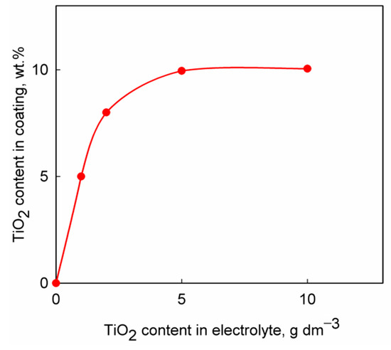 As follows from the experimental data (Figure 1), the percentage of the TiO2 dispersed phase in the resulting composite coatings grows with an increase in the weight content of titanium dioxide in the plating solution. However, when a certain threshold concentration is reached, a limit value of TiO2 content in the coating is reached, which is about 10 wt.% at the applied current density of 10 mA cm–2. This dependence is typical of many types of electrodeposited composites [25,26]; it is explained by the fact that the adsorption of a dispersed phase on the surface of a deposited film, which precedes the introduction of these particles into the coating, obeys the Langmuir type isotherm equation [16].