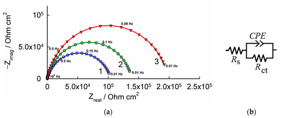 The value of Rct is associated with the Faraday current of an electrochemical process [33]. A decrease in the value of Rct indicates the acceleration of the charge transfer.