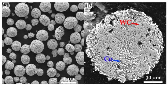The morphologies of WC-17Co powder (a) surface, 2000×, (b) cross-section, 5000×.