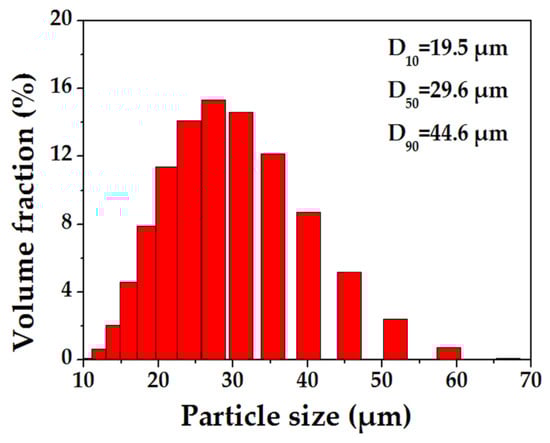 Raw materials used in this study were commercially available conventional WC-17Co powders with WC size of 0.2–2 μm (Ganzhou Zhangyuan Tungsten Advance Material Co., Ltd., Ganzhou, China). An agglomeration sintering method was used to manufacture these powders. The surface and cross-section morphologies of WC-17Co powders were shown in Figure 1. The size distribution of WC-17Co powders analyzed by a laser diffraction meter (GSL-1020, Liaoning Instrument Research Institute Co., Ltd., Liaoning, China) was shown in Figure 2. The size distribution (D10, D50, and D90) of powders was 19.5 μm, 29.6 μm, and 44.6 μm, respectively. Q235 steel with dimensions of 50 mm × 25 mm × 3 mm was used as a substrate for depositing single WC-17Co coatings. Prior to spraying, Q235 steel substrate was pre-cleaned by acetone for 10 min in ultrasonic cleaner, and then grit blasted by aluminum oxide of 700 μm to achieve a roughened surface for improving the bonding strength between the coating and substrate.
