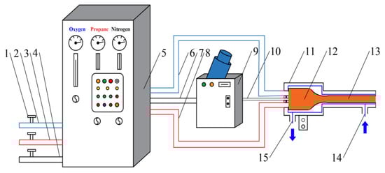 Schematic diagram of HVOF and WS spray system: (1) valve, (2,6) oxygen pipe, (3,8) propane pipe, (4,7) nitrogen pipe, (5) console cabinet, (9) powder feeder, (10) powder feeding pipe, (11) spray gun, (12) flame chamber, (13) spraying tube, (14) cold water inlet, and (15) cold water outlet.