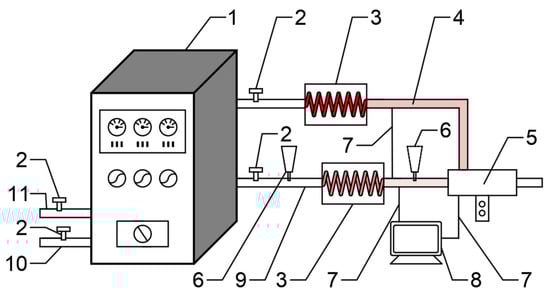 Schematic diagram of cold-spray system: (1) console cabinet, (2) Valve, (3) gas heater, (4) accelerating gas pipe, (5) spray gun, (6) powder feeder, (7) thermal couples, (8) display panel, (9) carrier gas, (10) powder feeder gas inlet, (11) accelerating gas inlet.