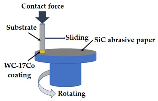 The abrasive wear test was carried out by a pin-on-disk method. The detail of the preparation for wear specimens can be found in the literature, namely [45]. The schematic diagram of abrasive wear test was shown in Figure 5. The wear parameters of as-sprayed WC-17Co are listed in Table 2.