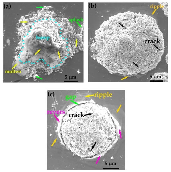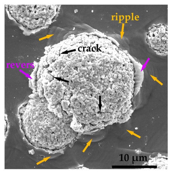 Figure 7 shows the surface morphologies of the WC-17Co splats deposited in various spraying methods. It can be seen that a WC-17Co splat deposited by HVOF showed a center hump (marked in cyan dot circle in Figure 7a), and some radial splashes (as indicated by the green arrow in Figure 7a) presented at the edge of the splat. Meanwhile, there were also observed some molten areas (as indicated by the yellow arrow in Figure 7a) in the WC-17Co splat, while the WC-17Co splat deposited by WS presented a typical pie shape morphology with no molten areas. However, due to the plastic deformation of the WC-17Co splat, some cracks (as indicated by the black arrow in Figure 7b) occurred on the surface of the splat, and an obvious ripple (as indicated by the orange arrow in Figure 7b) appeared around the splat, contributing to the cooperative deformation of the substrate. The morphology of the WC-17Co splat deposited by CS still remained nearly spherical in shape, which was the same as that of the original feedstock powders. Due to the high-velocity impacting effect of cold-sprayed splat, some cracks (as indicated by the black arrow in Figure 7c) also appeared on the surface of the large cold-sprayed WC-17Co splat. In addition, compared to the analysis results of the warm-sprayed WC-17Co splat, the plastic deformation of the substrate was more severe after cold spraying, more ripple (as indicated by the orange arrow in Figure 7c) and revers (as indicated by the purple arrow in Figure 7c) phenomena appeared around the splat. Moreover, there appeared gaps (as indicated by green arrow in Figure 7c) between the splat and the substrate. Meanwhile, it can be further observed that the embedding depth of the small splat into Q235 steel substrate was deeper than that of the large splat (as shown in Figure 8).