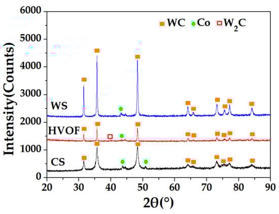 A warm spraying (WS) process, as a new kind of thermal spraying technology, has been used to prepare metal (e.g., Al, Cu, and Ti etc) [21,22,23], Ti6Al4V [24], hydroxyapatite (HA) [25], HA/Ti [26], Ti-Al-based intermetallic coatings [27]. Meanwhile, due to the high particle temperature, which is nevertheless lower than the melting point characteristic of standard WS processes, WC-based cermet coatings were successfully deposited by warm spraying [28,29,30,31,32]. Chivavibul et al. [28,29] have studied the microstructure, mechanical properties, and wear resistance of WC-Co coatings with various Co contents determined by WS and HVOF processes. The results showed that the fracture toughness of warm-sprayed WC-Co coatings increased was the Co content increased, and the wear resistance of warm-sprayed WC-Co coatings was better than those of HVOF-sprayed coatings [29]. Watanabe et al. [31,32] reported that WC-Co/Cu and WC-Co/Al multilayer coatings were successfully fabricated by warm spraying. The results showed that, due to higher volume fraction of copper in WC-Co/Cu coating, the work of the fractured WC-Co/Cu coatings was higher than the monolithic WC-Co coatings, as well as the bending strength was moderately better [31]. The durability of WC-Co/Al multilayer coatings was enhanced by ductile aluminum [32]. At present, there are few reports on the research of warm-sprayed WC-Co coatings, but it can be found from existing reports that the phase compositions of WC-Co coatings prepared by warm spraying were the same as that of those powders.