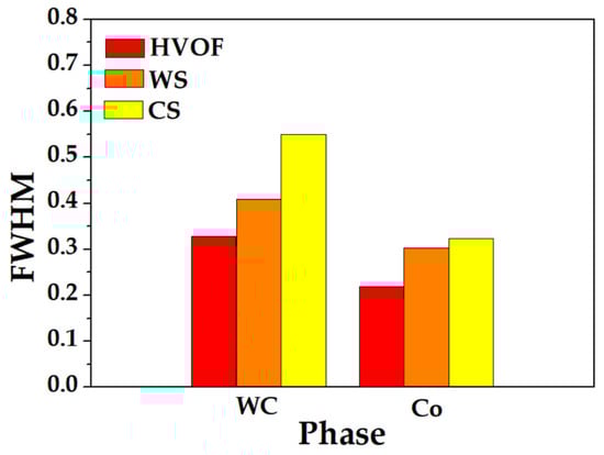 Full widths at half maximum (FWHMs) of WC and Co in WC-17Co coatings formed in various spraying ways.