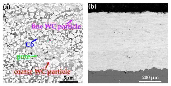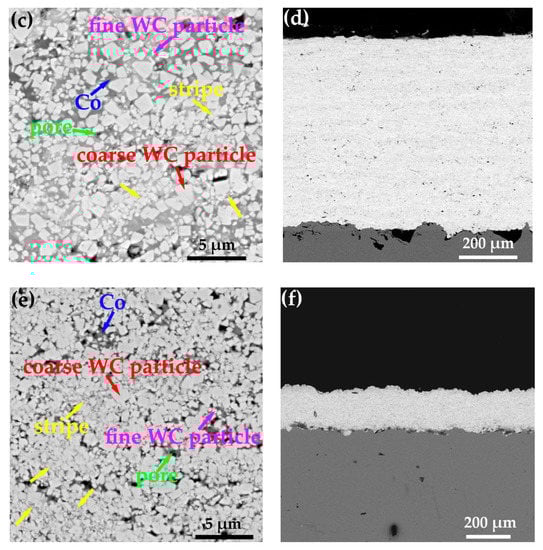 WC-Co cermet materials, due to their exceptional comprehensive properties, are widely used as protective coatings of wear-resistant parts in many fields (e.g., aerospace, automobile, petrochemical, equipment manufacturing) [1,2,3,4,5]. Therefore, WC-Co coatings were prepared by many researchers using various spraying technologies. Thermal spraying processes, such as high-velocity oxygen-fuel (HVOF) and plasma spray, are the most frequently used technology to fabricate WC-Co cermet coatings. The microstructure and properties (e.g., mechanical, wear behavior, erosion behavior) of WC-Co coatings prepared by plasma spraying were investigated [6,7,8,9,10]. Studies showed that WC-Co coatings could improve the properties of the substrate, especially the coatings with a dense microstructure. However, due to the high temperature effect of plasma spraying, the decarburization and decomposition phenomena of WC ceramic phase always occurred in the as-sprayed coatings, resulting in the formation of W, W2C, Co3W3C, or Co6W6C phases [6,7,8,9,10]. Due to the low flame temperature and short residence time of particles in flame flow, the HVOF process is a favorable and feasible method to fabricate cermet coatings with excellent properties (e.g., high microhardness, low porosity, high bonding strength, and good wear resistance), especially suitable for preparing carbide cermet coatings [11,12]. Therefore, researchers have conducted a significant amount of research on the microstructure and properties of HVOF-sprayed WC-Co coatings with different WC size (e.g., conventional, fine, nanostructured, bimodal, and multimodal) and/or Co content (e.g., 10Co, 12Co, 17Co, and 25Co) [13,14,15,16,17,18,19,20,21,22]. Shipway et al. [15] reported that, due to the higher decomposition of nanostructured WC, the wear rate of conventional WC-12Co coating was lower than that of nanostructured WC-12Co coating. Cho et al. [16] also reported that, due to the denser microstructure and lower decomposition of micron WC-Co coating, the hardness and friction coefficient of micron WC-Co coating were higher than of nano WC-Co coating. Guilemany et al. [17] reported that, due to the more decarburization phenomena in the nanostructured WC-12Co coatings, the microhardness of the nanostructured WC-12Co coating was higher in comparison to bimodal and conventional WC-12Co coatings. Meanwhile, the bimodal WC-12Co coating showed a lower friction coefficient and better wear resistance than other coatings. Baumann et al. [18] reported that the fine WC-12Co coating showed the highest microhardness and wear resistance in comparison to nanostructured and conventional WC-12Co coatings. Ding et al. [3] showed that the multimodal WC-12Co coating with denser microstructure exhibited higher microhardness and better erosion resistance than submicron and conventional WC-12Co coatings. Although the WC-Co coatings could improve microhardness and wear/erosion resistance, W, W2C, Co3W3C, or Co6W6C phases also always occurred in the HVOF-sprayed coatings [3,13,14,15,16,17,18,19].