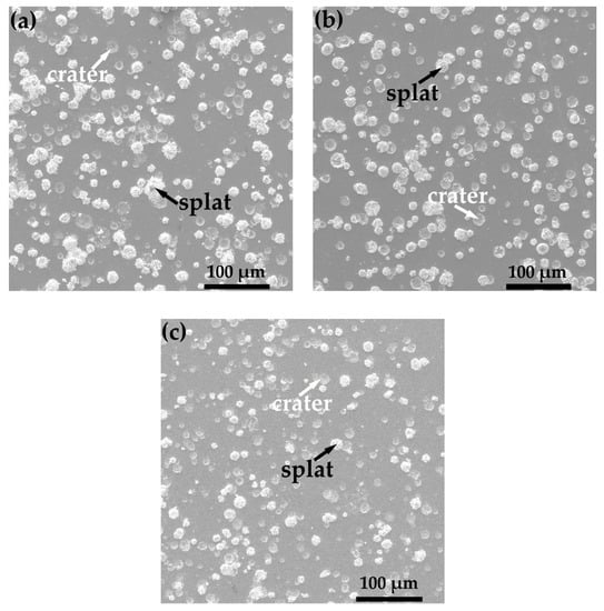 Figure 11 shows the cross-section morphologies of WC-17Co coatings formed by various spraying methods. It can be seen that there were no cracks or abscission phenomenons occurred between the coating and substrate (as shown in Figure 11b,d,f). Further analysis of the morphologies of WC-17Co coatings (as shown in Figure 11a,c,e) found that the interface between WC and Co in all WC-17Co coatings was well-bonded. Meanwhile, the content of fine WC particles (as indicated by the red arrow in Figure 11a,c,e) in the cold-sprayed coating was significantly more than the other coatings. The size range of fine WC particles formed in HVOF, WS, and CS was about 0.11–0.16 μm, 0.10–0.13 μm, 0.09–0.12 μm, respectively. It was also further indicated that more fragmented phenomenon of coarse WC particles occurred in the cold-sprayed WC-17Co coatings. These phenomena are consistent with the phase compositions analysis and results of WC-17Co coatings. By measuring the mean porosity and thickness of WC-17Co coatings formed in various spraying ways, it was found that the mean porosity of WC-17Co coatings formed in HVOF, WS, and CS was 1.57%, 0.89%, and 0.058%, respectively (as shown in Figure 12). In general, the microstructure of all coatings is dense; however, the porosity of warm-sprayed and cold-sprayed WC-17Co coatings was lower than that of HVOF-sprayed coating, and the porosity of cold-sprayed coating was the lowest. The main reasons for this phenomenon were attributed to solid-state particles’ continuous impact and compaction on the warm-sprayed or cold-sprayed WC-17Co coatings at the lower spraying temperature. Meanwhile, stripe structure (as indicated by the yellow arrow in Figure 11c,e) formed by the slippage of fine WC particles with a plastic flow of Co binder could fill the pores in the warm-sprayed or cold-sprayed WC-17Co coatings [41]. Therefore, due to the cold spraying high-velocity characteristic and more stripe structure in the cold-sprayed coating, the porosity of cold-sprayed WC-17Co coating was the lowest among all the coatings. The mean thickness of WC-17Co coatings formed in HVOF, WS, and CS was 544.33 ± 4.81 μm, 528.75 ± 5.98 μm, and 207.61 ± 9.64 μm, respectively (as shown in Figure 13). Figure 14 shows the morphologies of WC-17Co particles deposited onto Q235 steel substrate surface in various spraying ways. It can be found that craters were formed as the incident particles rebounding from the Q235 steel substrate surface (as indicated by white arrow in Figure 14). The ratio of WC-17Co splats (as indicated by black arrow in Figure 14) adhered on the Q235 steel substrate surface in HVOF, WS, and CS was 54.66%, 50.18%, and 30.12%, respectively. This illustrates that decreasing the spraying temperature resulted in more content of the craters caused by particles rebounding from the substrate surface. Therefore, this result also revealed that, although the porosity of cold-sprayed WC-17Co coating was the lowest in this study, more rebounding-particles phenomena presented during cold spraying process led to the lowest thickness of the cold-spraying coating among all the coatings.