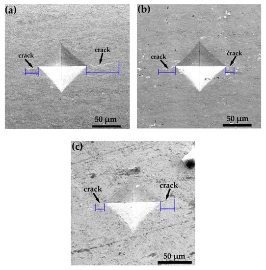 The average microhardness of WC-17Co coatings formed in HVOF, WS, and CS was 980.0 ± 17.6 HV0.3, 1034.8 ± 57.5 HV0.3, and 1136 ± 26.8 HV0.3, respectively (as shown in Figure 15). It can be found that the average microhardness of the cold-sprayed WC-17Co coating was the highest among all the coatings. Although the W2C phase in the coating could affect the hardness significantly [29], the content of W2C phase was very low in the HVOF-sprayed WC-17Co coating in this study. Hence, the influence of W2C phase on the hardness in this study was slight. Ji et al. [41] reported that stripe microstructure could enhance the spreading or flattening of WC-Co particles and improve the microstructure and microhardness of the coatings. Wang et al. [42] also reported that high content of nano WC and high density could increase the microhardness of cold-sprayed multimodal WC-12Co coatings. Therefore, combined with the microstructure analysis results of warm-sprayed or cold-sprayed WC-17Co coatings in this study, fine WC particles were formed based on the combined action of particles impacting on the substrate or pre-deposited layer and continuous impacting of incident particles. Meanwhile, a stripe structure was formed by the slippage of fine WC particles with a plastic flow of Co binder; in particular, a stripe structure was more prevalent in cold-sprayed coatings. Therefore, the average microhardness of cold-sprayed WC-17Co coating was the highest. The average fracture toughness of WC-17Co coatings formed in HVOF, WS, and CS was 8.88 ± 0.31, 10.42 ± 0.28, and 13.18 ± 0.49 MPa·m−1/2, respectively (as shown in Figure 16). The Vickers indentation cracks of as-sprayed WC-17Co coatings were shown in Figure 17. Lee et al. [48] reported that decreasing powder size or the mixing ratio of the coarse WC particles could increase the fracture toughness of the coatings. Chen et al. [49] reported that W2C phase could decrease the fracture toughness of the coating. Therefore, the fracture toughness of cold-sprayed WC-17Co coating was the highest among all the coatings in this study. This also illustrates that the fracture toughness increased with increasing the content of fine WC particles and stripe structure.