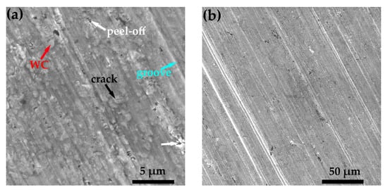 Cold spraying is a kind of technology in which high velocity solid-state particles impacted into substrates to form coatings [33]. Therefore, extensive research has been done into WC-based coatings with different WC size (e.g., conventional [34,35,36,37], such as nanostructured [37,38,39], bimodal [40], and multimodal [41,42]) coatings fabricated by cold spraying. Couto et al. [34] reported that cold-sprayed WC-12Co and WC-17Co coatings retained the same composition phases with the original powder, and the coatings with dense microstructure showed excellent tribological and electrochemical properties. Yin et al. [35] reported that WC-Co-Ni coatings with different WC mass fractions were successfully fabricated by cold spraying, and the coating formation mechanism and tribological performance were investigated. The results showed that metallic bonding between the WC-Co and Ni particles was a possibility that occurred due to the Co phase in the WC-Co powders, and then the fine WC-17Co pieces caused by high-velocity impacting remained in the WC-Co-Ni coating. In addition, the tribological performance of WC-Co-Ni coatings improved as the WC content increased. Li et al. [38] studied the deposition behavior of single nanostructured WC-12Co particle. The results showed that the dense nanostructured WC-12Co coating presented high microhardness (1800 Hv0.3), and post-annealing treatment was beneficial to improve the bonding between deposited nanostructured WC-12Co particles and the toughness of the coatings. Yang et al. [40] reported that cold-sprayed WC-(nanoWC-Co) coatings showed higher microhardness and toughness, as well as much higher wear resistance by comparing with HVOF-sprayed conventional WC-Co coatings. In addition, the post-spray annealing treatment could improve the toughness of the coating, especially the wear resistance. Ji et al. [42] reported that the mechanical and abrasive wear properties were influenced by the content of nano WC-17Co particles in the multimodal WC-17Co feedstocks. And the abrasive wear mechanism of multimodal WC-17Co was also investigated.