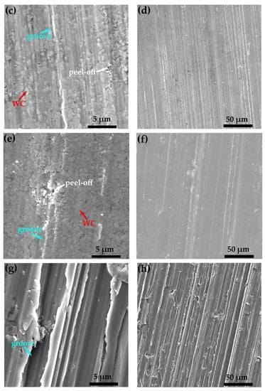 The worn surface morphologies of WC-17Co coatings formed in various spraying ways and Q235 steel substrate were shown in Figure 18. It can be seen that the main wear mechanism of all coatings was the groove (as indicated by the cyan arrow in Figure 18a,c,e) and some peel-offs (as indicated by the white arrow in Figure 18a,c,e), but the worn surface of Q235 steel was only wide and deep groove (as indicated by the cyan arrow in Figure 18g). The main reasons for the peel-off phenomenon in this study were that the crack formation (as indicated by the black arrow in Figure 18a) caused by the fracture of coarse WC particles resulted in WC particles pulled-out from the worn surface, or the exposed WC particles peeled off due to the poor bonding between WC particle and Co binder after the removal of soft Co matrix. Furthermore, in contrast to HVOF sprayed and warm-sprayed WC-17Co coatings, the grooves of cold-sprayed coating were smoother and shallower (as shown in Figure 18f). The reason for this phenomenon was that, according to the microstructure analysis of the cold-sprayed WC-17Co coating (as shown in Figure 11e), more fine WC particles and stripe structures presented in cold-sprayed WC-17Co coatings; fine WC particles uniformly distributed into the Co binder phase, resulting in an increase in the wear resistance of the coating. Figure 19 shows the average weight loss of WC-17 coatings formed in various spraying ways and Q235 steel substrate. The average weight loss of WC-17Co coatings formed in HVOF, WS, and CS was 8.15 ± 0.31 mg, 5.31 ± 0.32 mg, and 4.05 ± 0.41 mg, respectively. This also illustrates that combining with the results analysis of the microstructure, mechanical properties, and worn surface morphologies of the coatings, the cold-sprayed WC-17Co coating presented the lowest wear loss among all the coatings. However, the average weight loss of Q235 steel substrate was 21.77 ± 0.25 mg, which was more than 5 times that of the cold-sprayed WC-17Co coating.