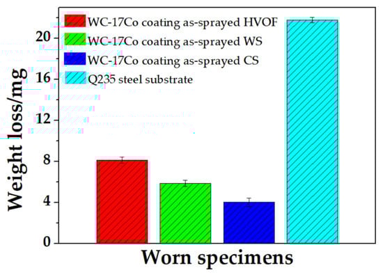 - The main wear mechanism of all coatings was the groove and some peel-offs. The average weight loss of the WC-17Co coatings formed in HVOF, WS, and CS was 8.15 ± 0.31 mg, 5.31 ± 0.32 mg, and 4.05 ± 0.41 mg, respectively. However, the average weight loss of Q235 steel was 21.77 ± 0.25 mg, which was more than 5 times that of the cold-sprayed WC-17Co coating.