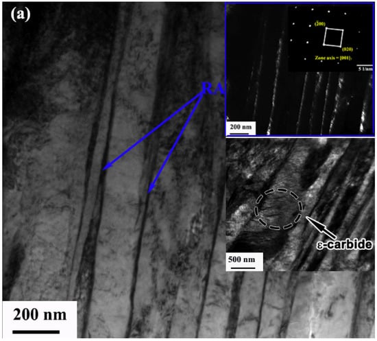 TEM micrographs of 22MnSi2CrMoNi (a) and 00Ni18Co9Mo4Ti (b) steel (RA: Retained Austenite).