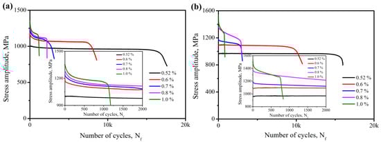 The cyclic hardening/softening curves of 22MnSi2CrMoNi and 00Ni18Co9Mo4Ti steel are showed in Figure 4. 22MnSi2CrMoNi steel shows a significant continuous cyclic softening phenomenon at strain amplitudes except at strain amplitude of 0.52% (Figure 4a). The curve is analyzed in three stages. The cyclic softening rate (SR) and the corresponding damage mechanism vary at each stage. The first stage involves the rapid cyclic softening. The second stage is the saturated stage of cyclic stress stability. In the first two stages of the steel test the microstructures evolve. As cyclic deformation progresses, the original dislocation substructure gradually shifts to a low-energy cell substructure [,]. The third stage is the rapid softening failure stage in which crack initiation and propagation result in the failure of the tested steel.