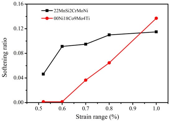 Cyclic softening rate versus strain range of 22MnSi2CrMoNi and 00Ni18Co9Mo4Ti steel.