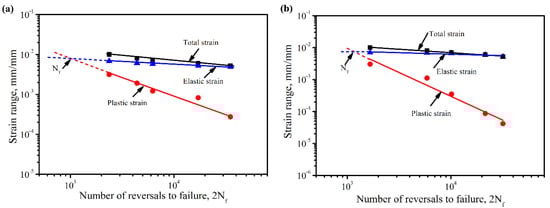 The plastic strain amplitude curves in Figure 7a are fitted according to Formula (3). In Figure 7a, the LCF lifetime of 22MnSi2CrMoNi steel is higher than that of 00Ni18Co9Mo4Ti steel at the same plastic strain amplitude. LCF lifetime mainly depends on the plastic strain amplitude of materials []. Therefore, it can be concluded that 22MnSi2CrMoNi steel has better LCF properties than 00Ni18Co9Mo4Ti steel from the influence of plastic strain amplitude on fatigue lifetime. In Figure 7b, the fatigue lifetime of 22MnSi2CrMoNi and 00Ni18Co9Mo4Ti steel is similar at the same total strain amplitude. The fatigue lifetime of 22MnSi2CrMoNi steel is slightly higher than that of 00Ni18Co9Mo4Ti steel at a high total strain amplitude. The fatigue lifetime is mainly determined by the yield strength of a material at a low total strain amplitude. A high yield strength indicates that the elastic strain accounts for a large proportion at a given total strain amplitude.
