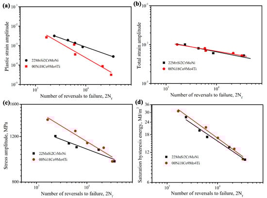 Curves of (a) plastic strain amplitude, (b) total strain amplitude, (c) stress amplitude, and (d) hysteresis energy versus the number of reversals to failure of 22MnSi2CrMoNi and 00Ni18Co9Mo4Ti steel.