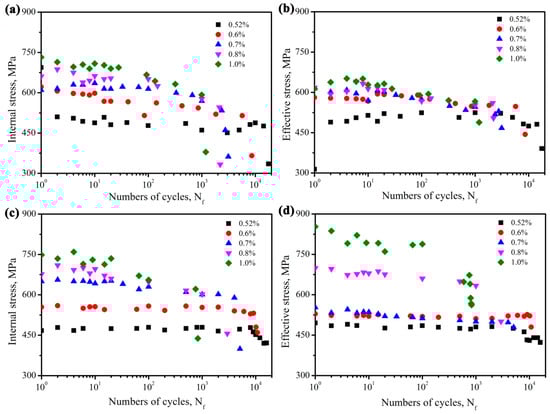 Evolution of the (a) internal stress and (b) effective stress with the number of cycles of 22MnSi2CrMoNi steel, (c) internal stress, and (d) effective stress versus the number of cycles of 00Ni18Co9Mo4Ti steel.