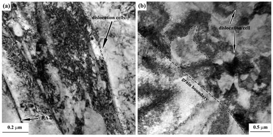 Figure 9 shows the dislocation morphology of 22MnSi2CrMoNi and 00Ni18Co9Mo4Ti steel safter the failure of cyclic deformation at 1.0% total strain amplitude. They are taken from the fracture surface. After the fatigue failure of 22MnSi2CrMoNi and 00Ni18Co9Mo4Ti steel at a total strain amplitude of 1.0%, the dislocation cells with many dislocations are formed in the lath martensite region. The formation and development of dislocation cells are a process in which dislocations in motion are partially eliminated and the free-slip distance increases. Dislocation cells are a manifestation of a low-energy state. Their appearance is conducive to the increase in plastic deformation capacity.
