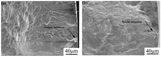 The fracture morphology of specimens mainly consists of three parts: a fatigue crack initiation region, a crack propagation stability region, and an instability transient region. Figure 10 shows the SEM morphology of the fatigue crack initiation region of the two types of tested steel. Moreover, the fatigue cracks of the two tested steels originate on the surface of the sample. Fatigue cracks usually initiate at the stress concentration on metal surfaces. The fatigue fracture surface of 22MnSi2CrMoNi steel shows a distinct river pattern. The main crack is obvious at total strain amplitude of 0.52%. The fracture morphology of 00Ni18Co9Mo4Ti steel does not show a river pattern. The primary crack is smaller, and the secondary crack is less at total strain amplitude of 0.52%.