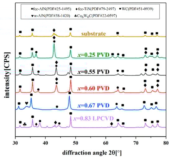X-ray diffractograms of the substrate and Ti1−xAlxN coatings.