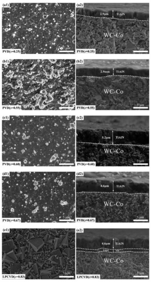(a1–e1) Surface and (a2–e2) fracture morphologies of the Ti1−xAlxN coatings.