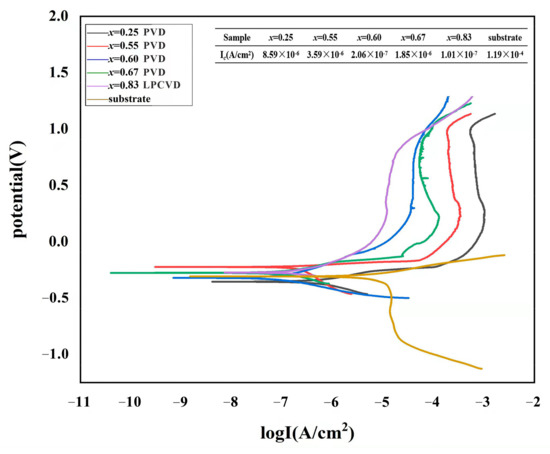 Potentiodynamic polarization curves of the Ti1−xAlxN coatings and substrate.