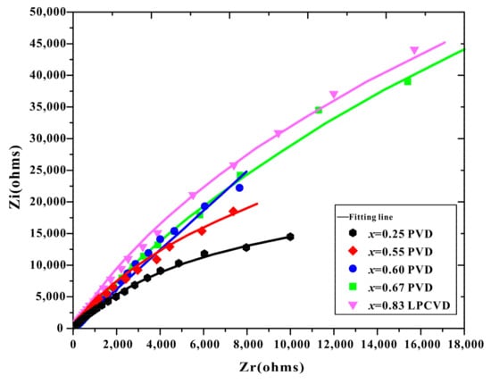 Figure 4 presents the Nyquist plots of the EIS spectra from the Ti1−xAlxN coatings tested in a 3.5 wt.% NaCl solution. As shown in Figure 4, the five coatings displayed flattened capacitive arcs. The Nyquist plots of all the coatings showed only one semicircle, corresponding to the time constant of the Ti1−xAlxN coatings, which indicated that the substrate did not degrade for the passive film on the substrate and the short period of exposure time in the corrosive medium [31,32]. The LPCVD-Ti0.17Al0.83N coating had a semicircle with a larger diameter than the others over the whole frequency range, indicating the better corrosion resistance of the CVD-Ti0.17Al0.83N coating. The impedance of ions passing through the coating was the greatest, implying a denser, more uniform microstructure and the superior dielectric property of the CVD-Ti0.17Al0.83N coating [33].