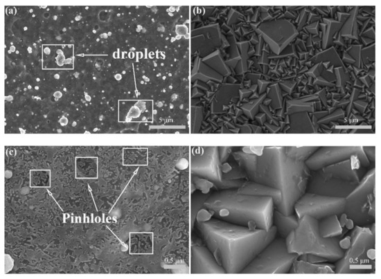 Surface morphologies of the Ti1−xAlxN coatings after a 20-day immersion corrosion test. (a,b) Original surface morphology and (c,d) corroded surface after immersion of PVD-Ti0.40Al0.60N and LPCVD-Ti0.17Al0.83N coatings, respectively.