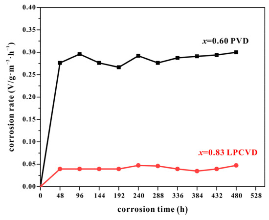 As shown in Figure 7, the corrosion rate of the Ti0.17Al0.83N was significantly lower than that of the Ti0.40Al0.60N coating. Conclusively, the homogeneous crack-free microstructure and fewer defects in the LPCVD-Ti0.17Al0.83N coating were beneficial for improving corrosion resistance compared with the PVD-Ti1−xAlxN coatings.